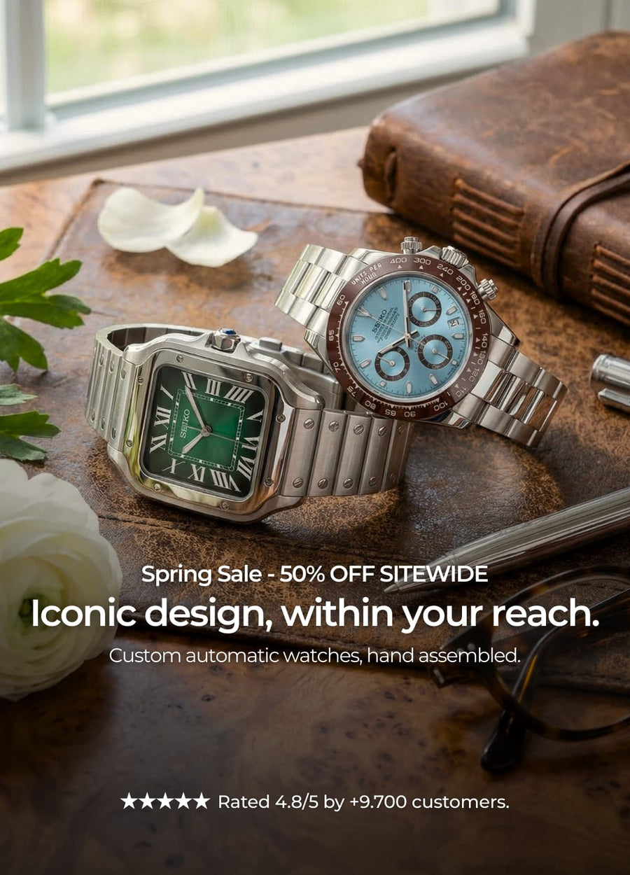 Designs icónicos de luxo, montados à mão com movimento Seiko. A mesma estética, a um preço acessível.