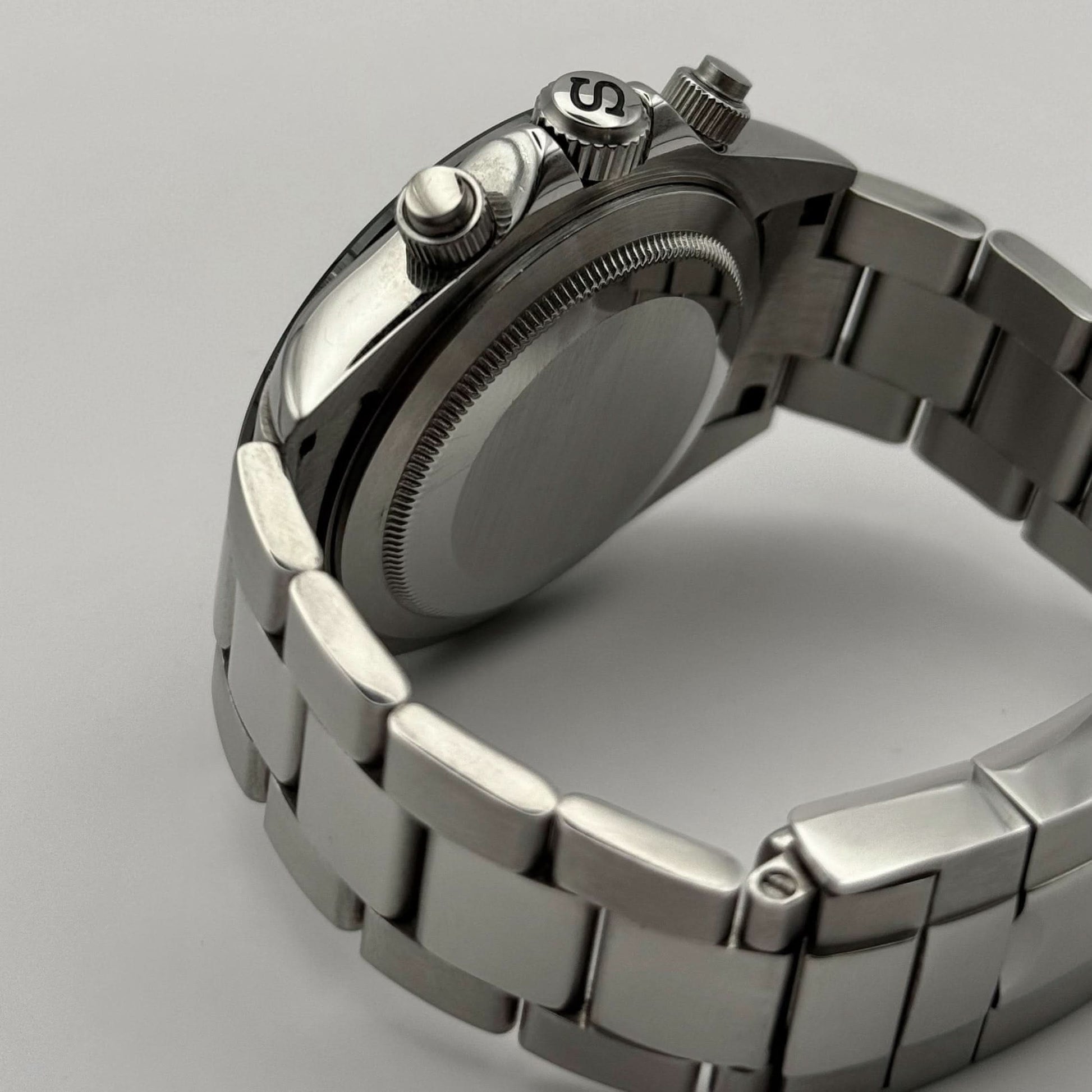 Diâmetro 40mm (sem contar a coroa) Movimento Movimento híbrido Seiko VK63 (combina automático com quartzo) Espessura 12mm Vidro Safira, anti-risco com tratamento anti-reflexo Luminova Sim Caixa Aço inoxidável 904L Coroa Rosqueada Bezel Cerâmica Tamanho do pulso 14,5cm a 22cm (ajustável) Lugs 20mm Pulseira Aço Inoxidável 904L Parte de Trás Aço (fechado) Resistência à água 3 ATM Chronograph funcional e submostradores Sim Sturdy, elegant and unique! It's a watch I can wear to both business meetings and casual nights out.